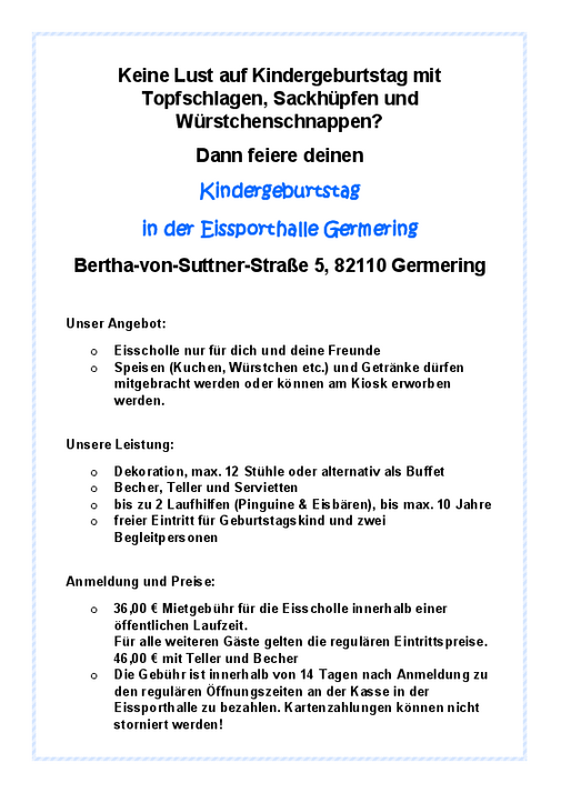 Nun könnt Ihr Euren coolen Geburtstag mit Freunden auf unserer Eisscholle in der Eissporthalle Germering feiern.
